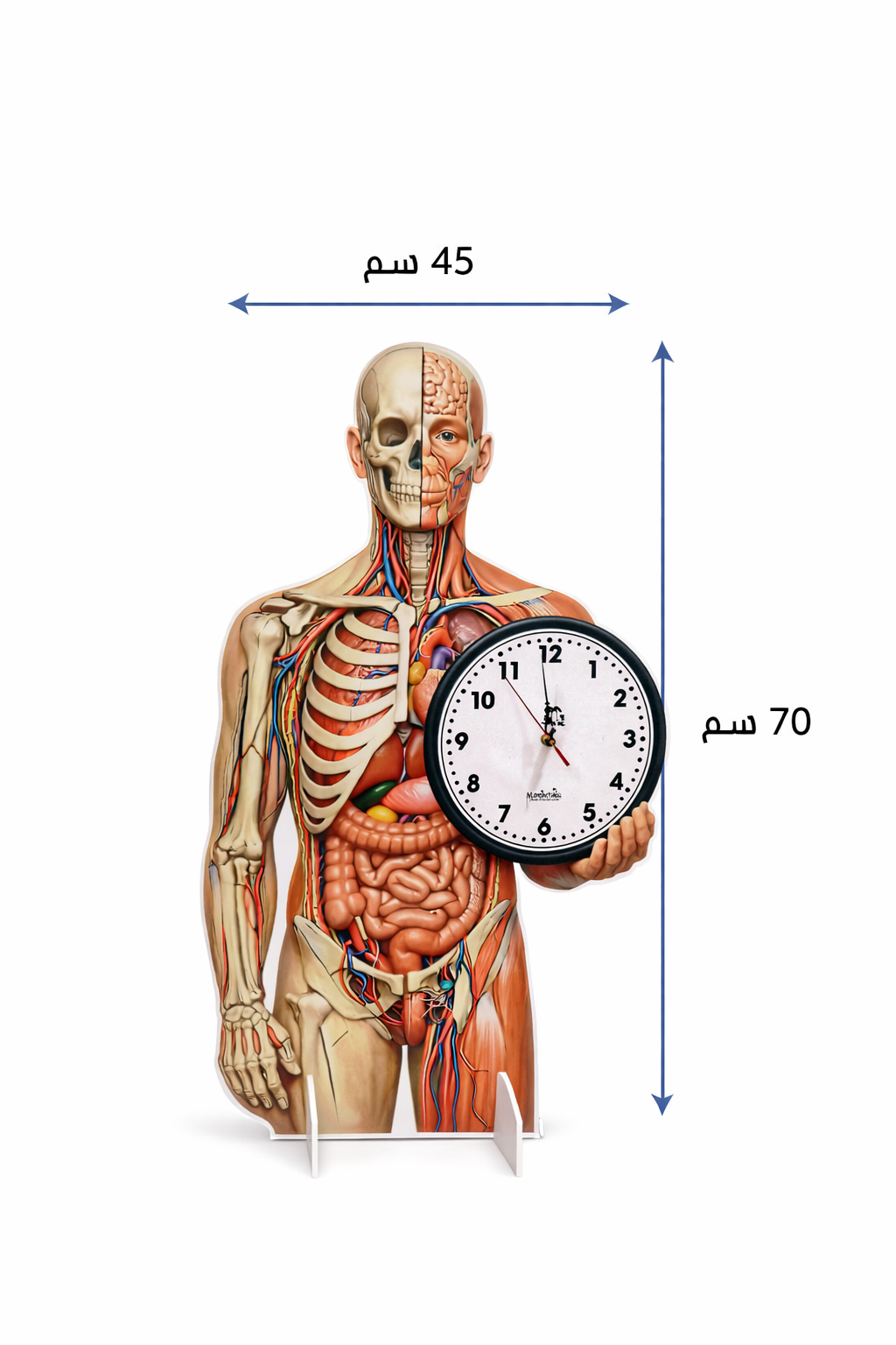 الساعة تأتي على شكل مجسّم تشريحي إنساني واقعي ، ويحمل بيده ساعة حائطية دائرية تضيف بعدًا رمزيًا يعكس أهمية الوقت في مجال الصحة والعلاج.